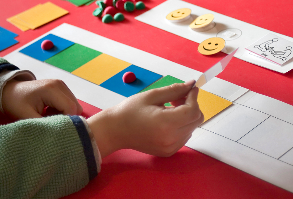 Student completing structured patterning activity and using a token system for reinforcement. |